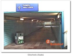 Friedrich-WilhelmshütteGeislingen (Steige) Glauchau (Sachs.)Göschwitz (Saale)Über diese Links kommen Sie zur entsprechenden Bahnstation im Zielbahnhof. Es wird dabei ein neues Fenster geöffnet, damit Sie das Fotoalbum danach weiter benutzen können.Mit SEITE VOR wird die nächste Seite des Fotoalbums angezeigt mit SEITE ZURÜCK blättern Sie zur vorherigen Seite. Über < INDEX kommen Sie zurück zur Ausgangsseite.