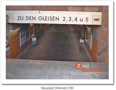 Neustadt (Weinstr) HbfNeu-UlmVelbert NevigesNidderauÜber diese Links kommen Sie zur entsprechenden Bahnstation im Zielbahnhof. Es wird dabei ein neues Fenster geöffnet, damit Sie das Fotoalbum danach weiter benutzen können.Mit SEITE VOR wird die nächste Seite des Fotoalbums angezeigt mit SEITE ZURÜCK blättern Sie zur vorherigen Seite. Über < INDEX kommen Sie zurück zur Ausgangsseite.