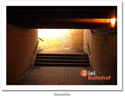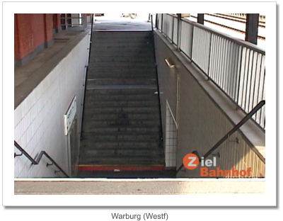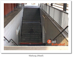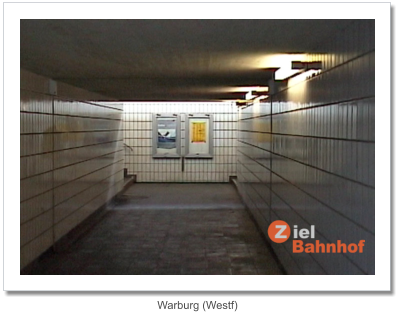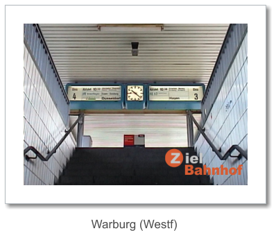 Warburg (Westf)Wuppertal-BarmenWeinböhlaWeßling (Oberbay)Über diese Links kommen Sie zur entsprechenden Bahnstation im Zielbahnhof. Es wird dabei ein neues Fenster geöffnet, damit Sie das Fotoalbum danach weiter benutzen können.Mit SEITE VOR wird die nächste Seite des Fotoalbums angezeigt mit SEITE ZURÜCK blättern Sie zur vorherigen Seite. Über < INDEX kommen Sie zurück zur Ausgangsseite.