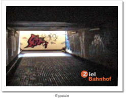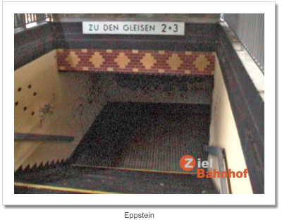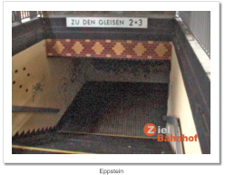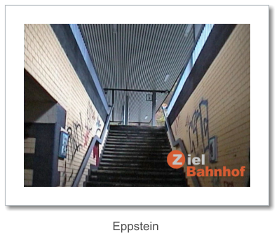 EisenachEmmendingenEnsdorf (Saar)EppsteinÜber diese Links kommen Sie zur entsprechenden Bahnstation im Zielbahnhof. Es wird dabei ein neues Fenster geöffnet, damit Sie das Fotoalbum danach weiter benutzen können.Mit SEITE VOR wird die nächste Seite des Fotoalbums angezeigt mit SEITE ZURÜCK blättern Sie zur vorherigen Seite. Über < INDEX kommen Sie zurück zur Ausgangsseite.